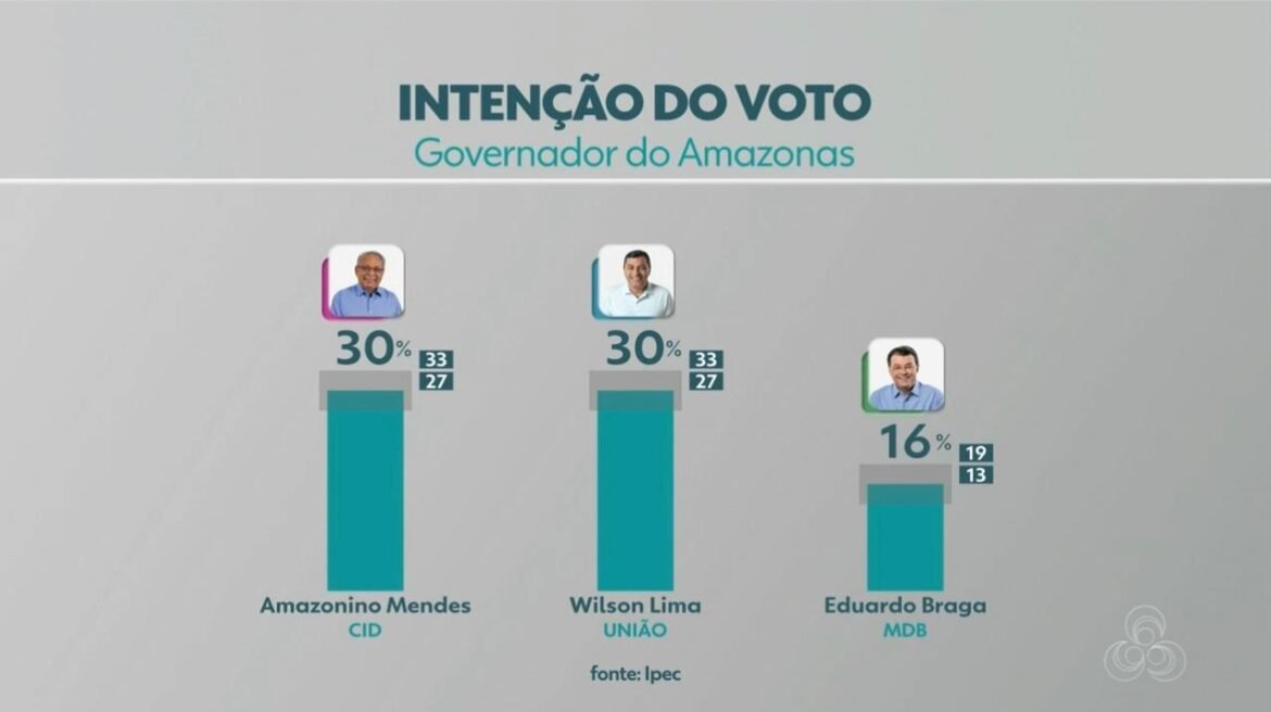O governador do Amazonas e candidato à reeleição, Wilson Lima (União Brasil), aparece empatado nas intenções de voto com o candidato Amazonino Mendes (Cidadania), com 30% cada um, aponta pesquisa Ipec, contratada pela Rede Amazônica e divulgada nesta quarta-feira, 24. Entre abril e agosto deste ano, Lima cresceu 11 pontos percentuais, se considerada a pesquisa Real BigData, na qual ele aparecia com 19% das intenções de votos. Amazonino, por sua vez, perdeu dois pontos na corrida ao Executivo. Há quatro meses, ele aparecia com 32% e estava à frete do atual governador.