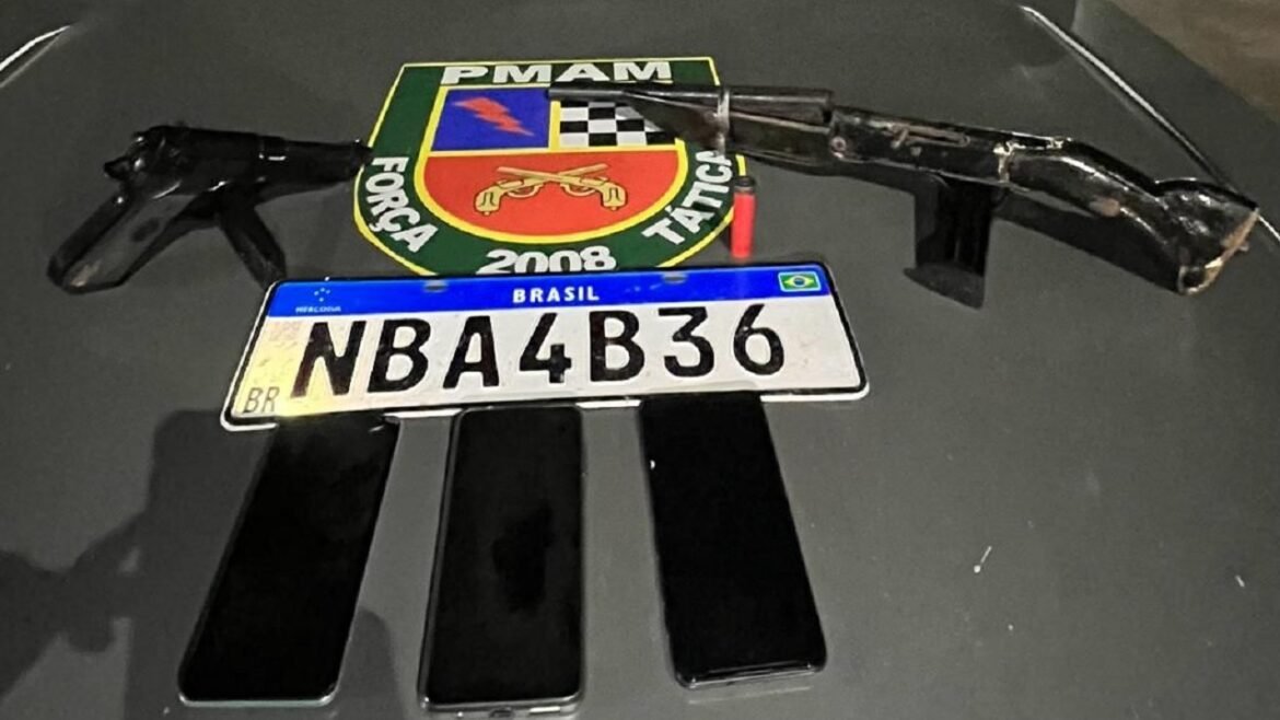 Policiais militares da Força Tática prenderam, na madrugada desta quarta-feira (05/04), três homens de 28 e 30 anos. O trio foi preso no município de Iranduba, a 27 quilômetros de Manaus, por suspeita de envolvimento em crimes de porte ilegal de arma de fogo e associação criminosa.