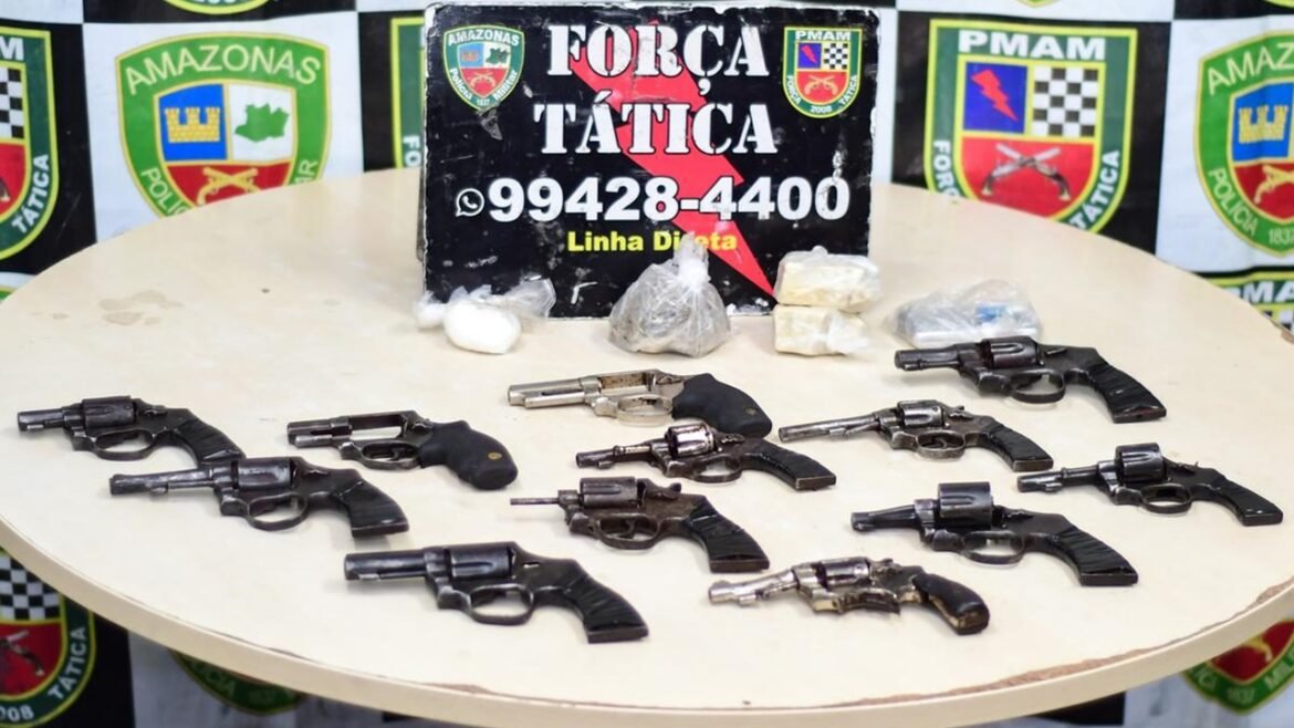 Por volta das 14h30 desta terça-feira (26), uma equipe da Força Tática da Polícia Militar do Amazonas apreendeu 12 armas de fogo no bairro Nova Vitória, localizado na zona Leste de Manaus. De acordo com o relatório de ocorrência, a equipe patrulhava pelo bairro quando recebeu uma denúncia, via Linha Direta, sobre um grupo de homens armados na rua Abraão, próximo a uma área de mata.
