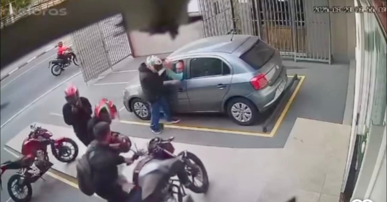 - Quatro suspeitos chegaram em duas motos e iniciaram o roubo.
