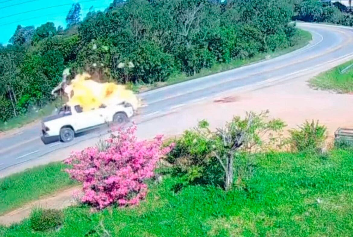 Imagens de câmeras de segurança de uma propriedade próxima mostram o momento exato do acidente. O vídeo registra o motociclista perdendo o controle logo após uma curva e entrando na pista contrária, onde bate de frente com a caminhonete.