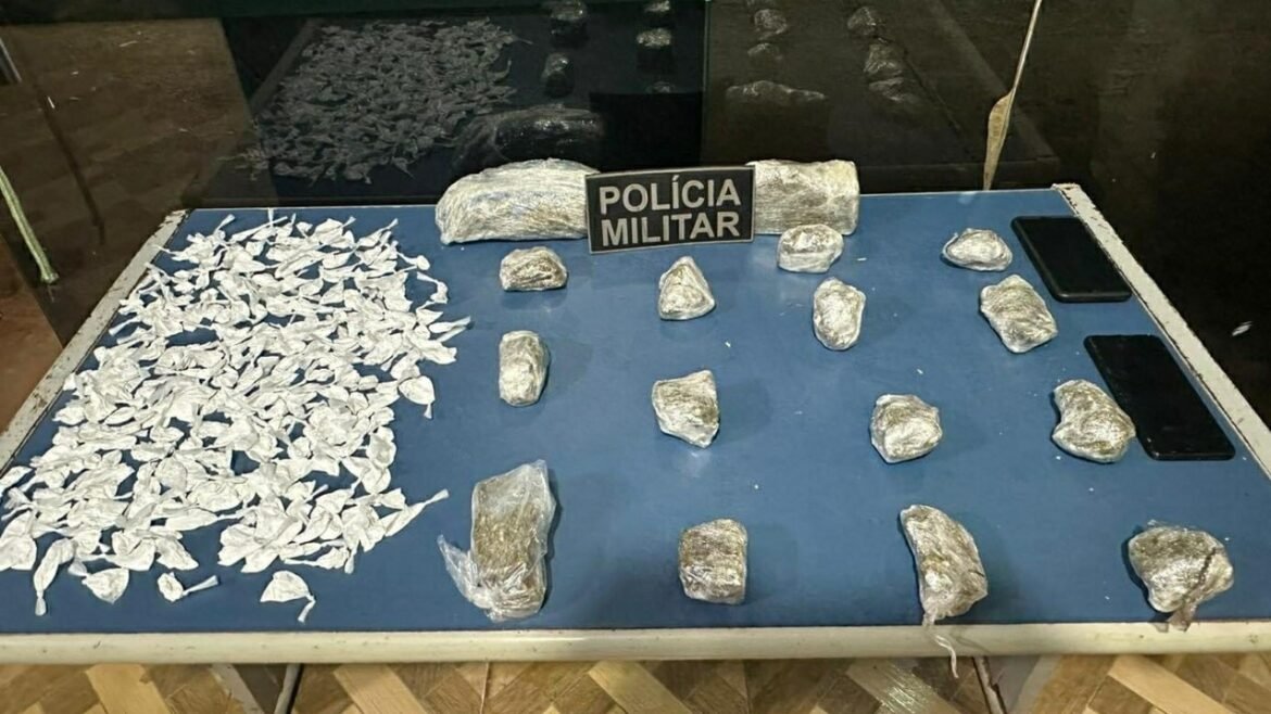 Ao realizarem a abordagem, os policiais encontraram, com as duas mulheres, 235 porções de substância com aspecto de cocaína; 14 porções e mais uma porção grande de substância entorpecente, supostamente maconha; dois aparelhos celulares e R$ 37,00 em espécie.